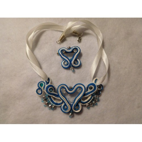Soutache koruissa lasihelmiä.Kaulakorun pit.n.41 cm,sydämen korkeus 4 cm.Rinta-/huivineula 3x3,5 cm.