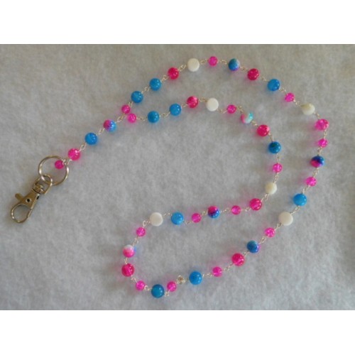 Avainkorussa sinisiä,pinkkejä ja valkoisia lasihelmiä.