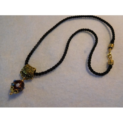 Koru mustalla nyörillä.Kullanvärinen riipuspidike ja punainen lasihelmi,jossa sinisiä pisaroita.