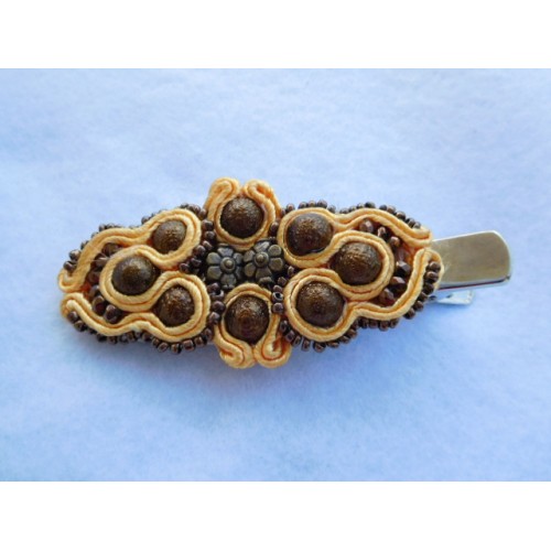 Korussa keltaista nauhaa ja ruskeita lasihelmiä.Lukko korumetallia. Pituus n. 45 cm,leveys edessä ..